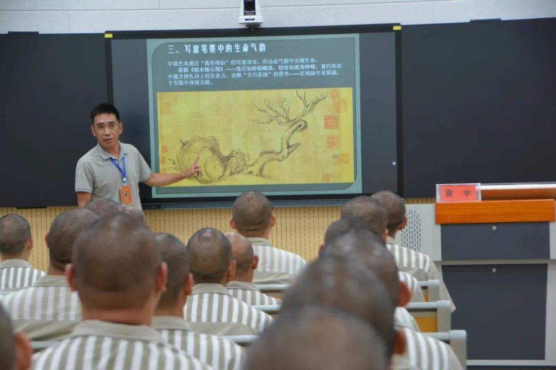 黔西南州兴义一中教师、民盟盟员雷宇以题为《“以美滋人 向美而生”——从中国传统美学谈起》为服刑人员开展美育教育培训。讲座以文人画的生命追寻、花鸟画中的生意宇宙、写意笔墨中的生命气韵、现代新儒家的生命安顿、当代艺术中生命色彩转化、书写行为中的生命修行、中国美学与生活等七个方面对中国绘画、书法的历史、哲学、人文道德进行深入浅出的讲解,讲授中国传统艺术美学的魅力。通过美育教育培训,提升服刑人员美学修养,促进服刑人员的心智启迪和道德重塑,帮助他们重新认识自我,积极改造,早日回归社会。