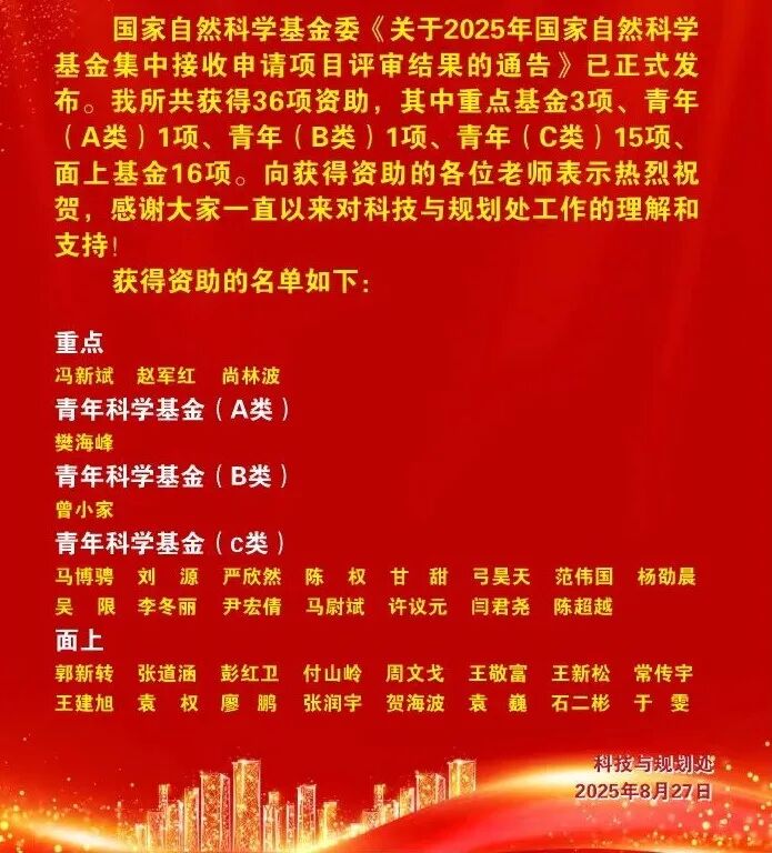 据国家自然科学基金委员会《关于2025年国家自然科学基金集中接收申请项目评审结果的通告》,民盟中国科学院地球化学研究所支部盟员曾小家获青年科学基金(B类)资助;盟员贺海波、于雯获面上基金资助。