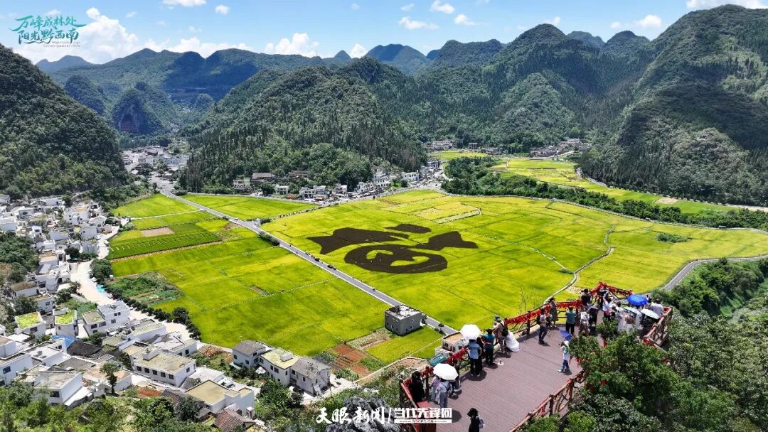 游客在万峰林景区观赏稻田画。图/刘朝富