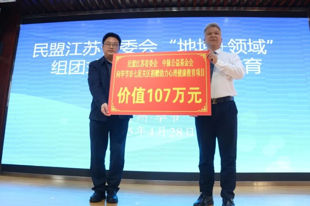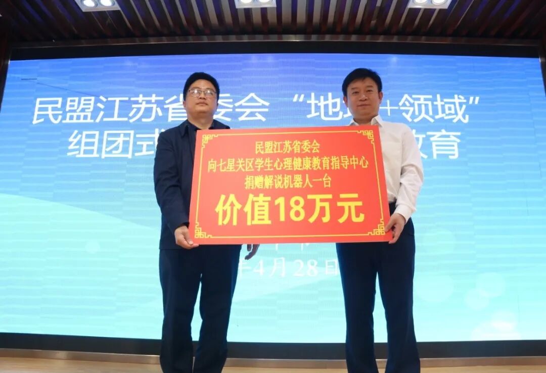 在捐赠仪式上,民盟江苏省委会向七星关区学生心理健康教育指导中心捐赠价值18万元的解说机器人,江苏省中脉公益基金会向七星关区捐赠107万元专项资金,用于心理健康教育项目建设。同时,分别向竹园中学、响水乡中心校、毕节六中捐赠4万元、5万元、3万元校园改善资金,并向毕节六中和鸭池镇中心校分别捐赠500册图书,助力书香校园建设。